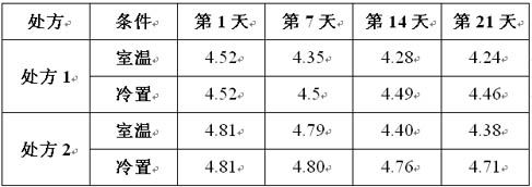 結(jié)果表明,隨樣品保存時(shí)間延長(zhǎng),PH值均呈下降趨勢(shì)。室內(nèi)放置保存樣品PH值下降比較大,冷藏樣品PH值下降較小。