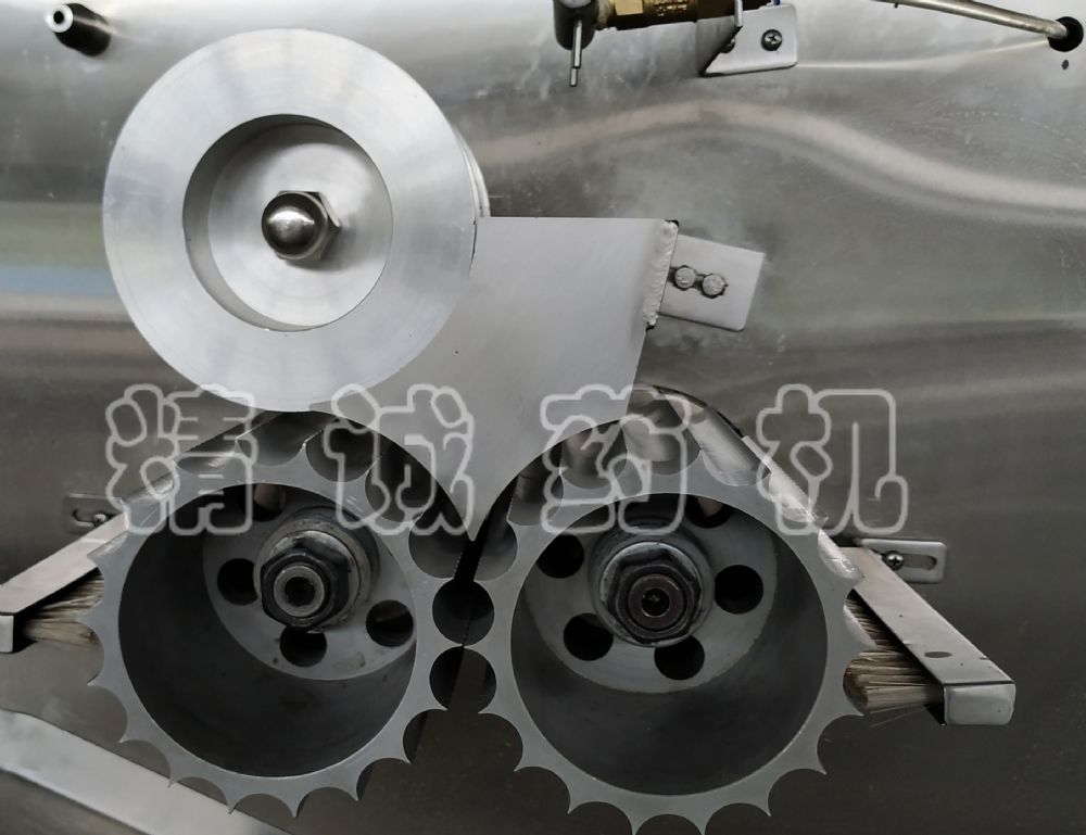 3、制丸部分的搓丸和切丸機構(gòu)裝在一個變速箱內(nèi),機件潤滑條件良好,切丸速度可通過無級變速機的旋鈕調(diào)節(jié),使?jié)L刀可獲得6-30轉(zhuǎn)/分的轉(zhuǎn)速,直到切丸速度達(dá)到與出條速度匹配。