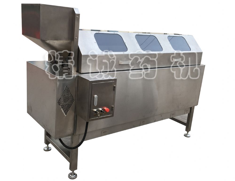 該機可單機使用也可與制丸機和提升機配套使用,提升機將成品藥丸提升后經(jīng)溜槽進入旋轉(zhuǎn)的滾筒篩內(nèi),兩節(jié)滾筒篩在主動摩擦膠輪的帶動下,順時針旋轉(zhuǎn),分別選出符合要求的各種丸劑。在篩選的過程中會出現(xiàn)丸劑直徑正好與篩孔大小一致的情況,丸劑夾在篩孔上,這時安裝在滾筒篩側(cè)邊的滾刷或硅膠壓輥能將藥丸擠出。
