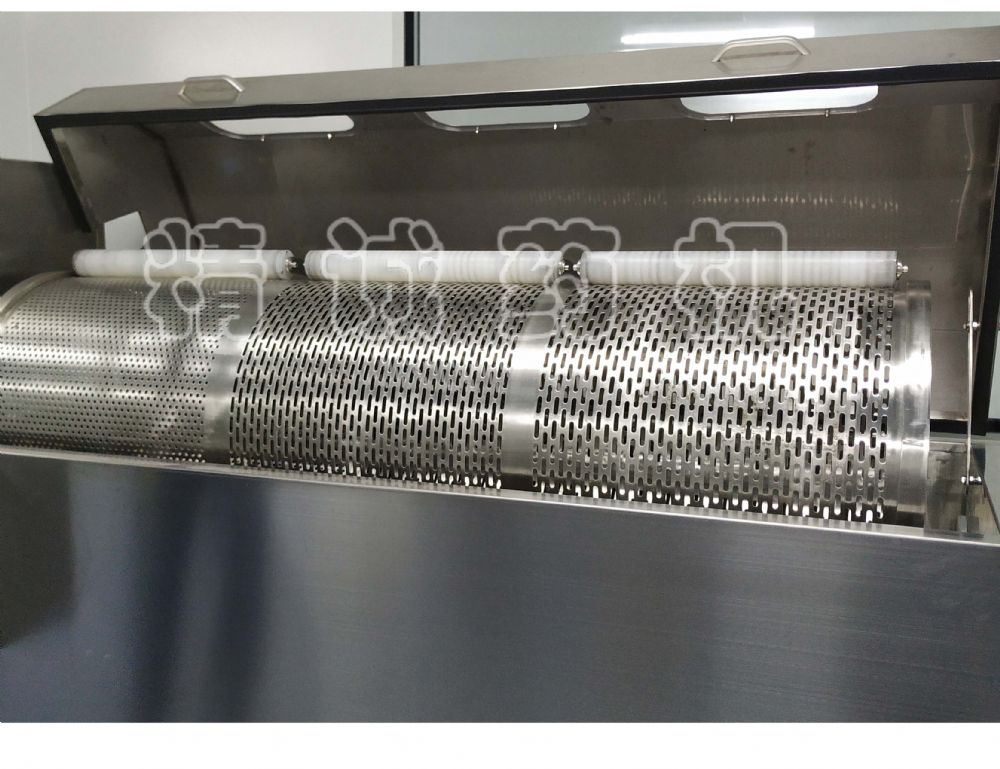 將壓輥支架整體向后傾斜后,將篩筒抬下用蒸餾水沖洗干凈,然后用酒精擦洗消毒后重新架放在傳動摩擦輪上。
